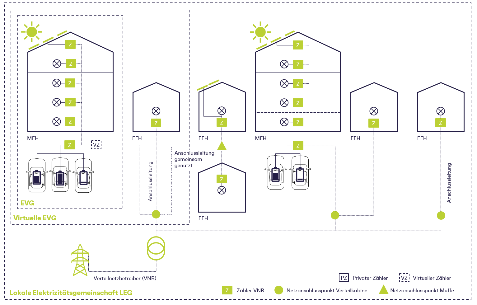Im Unterschied zur Eigenverbrauchsgemeinschaft (EVG), die sich auf ein Gebäude oder Areal beschränkt, ermöglicht die LEG eine energiewirtschaftliche Zusammenarbeit über mehrere Adressen hinweg.